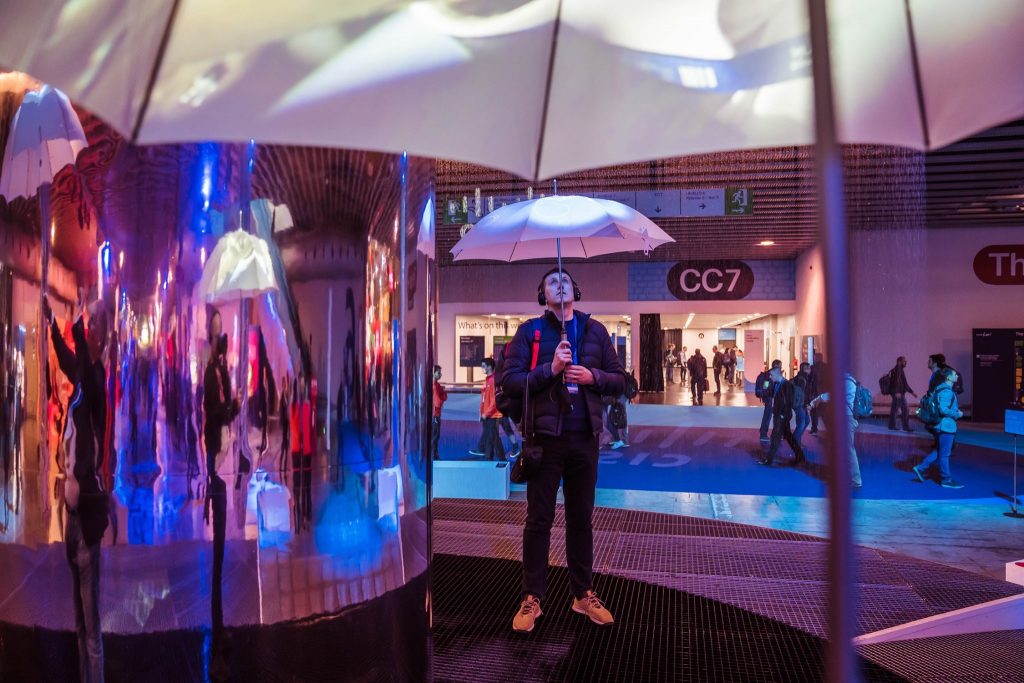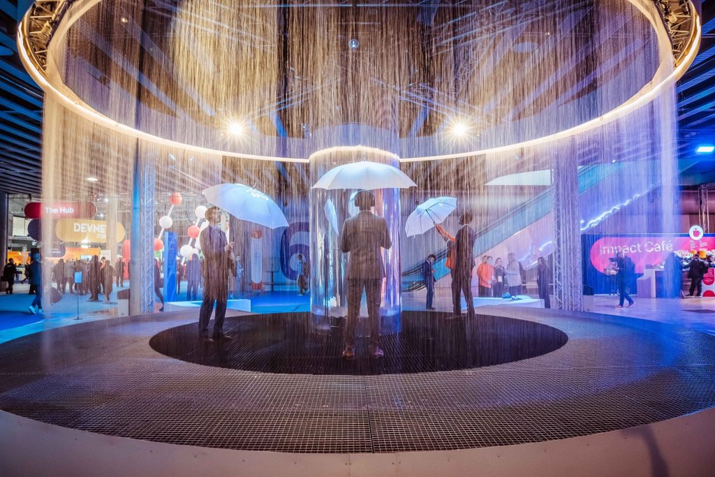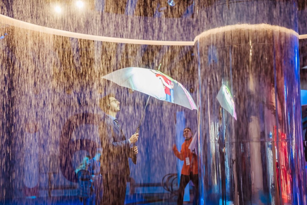 In the centre of the experience, a live curtain of rain acts as a screen and displays a number in large numerals that count up to 1 billion as lives around the world are positively affected by Cisco technology. By opening their ‘Smart Story’ umbrellas, guests can find out more about the ambition and view CSR stories.
