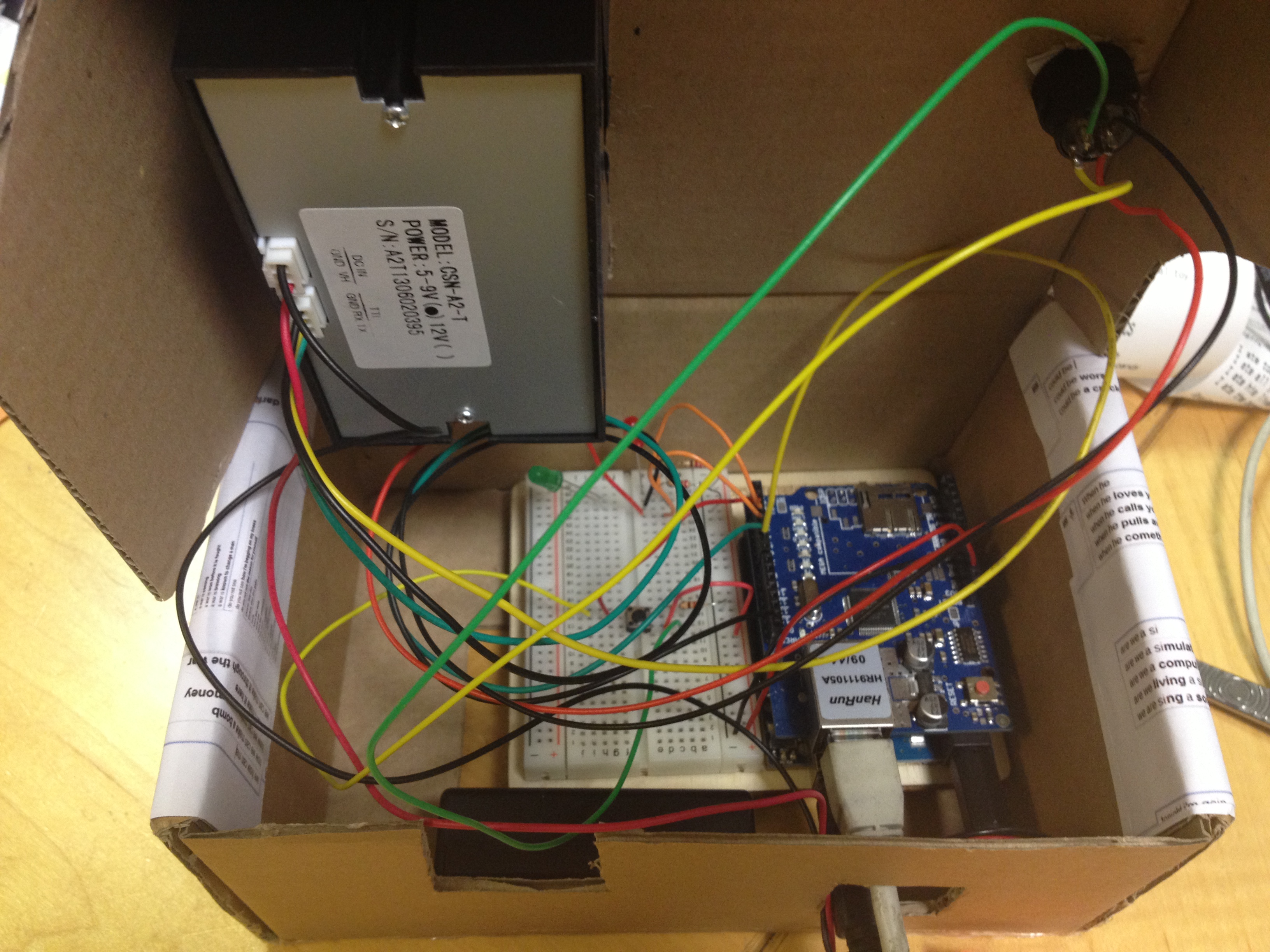 So, I had this mess of wires on my table and an internal company meeting looming, so the night before I grabbed an empty box off a desk, papered it with Google Poetics quotes and stuffed the whole sorry mess inside and took the opportunity to run the Arduino off a 9V battery for the first time.