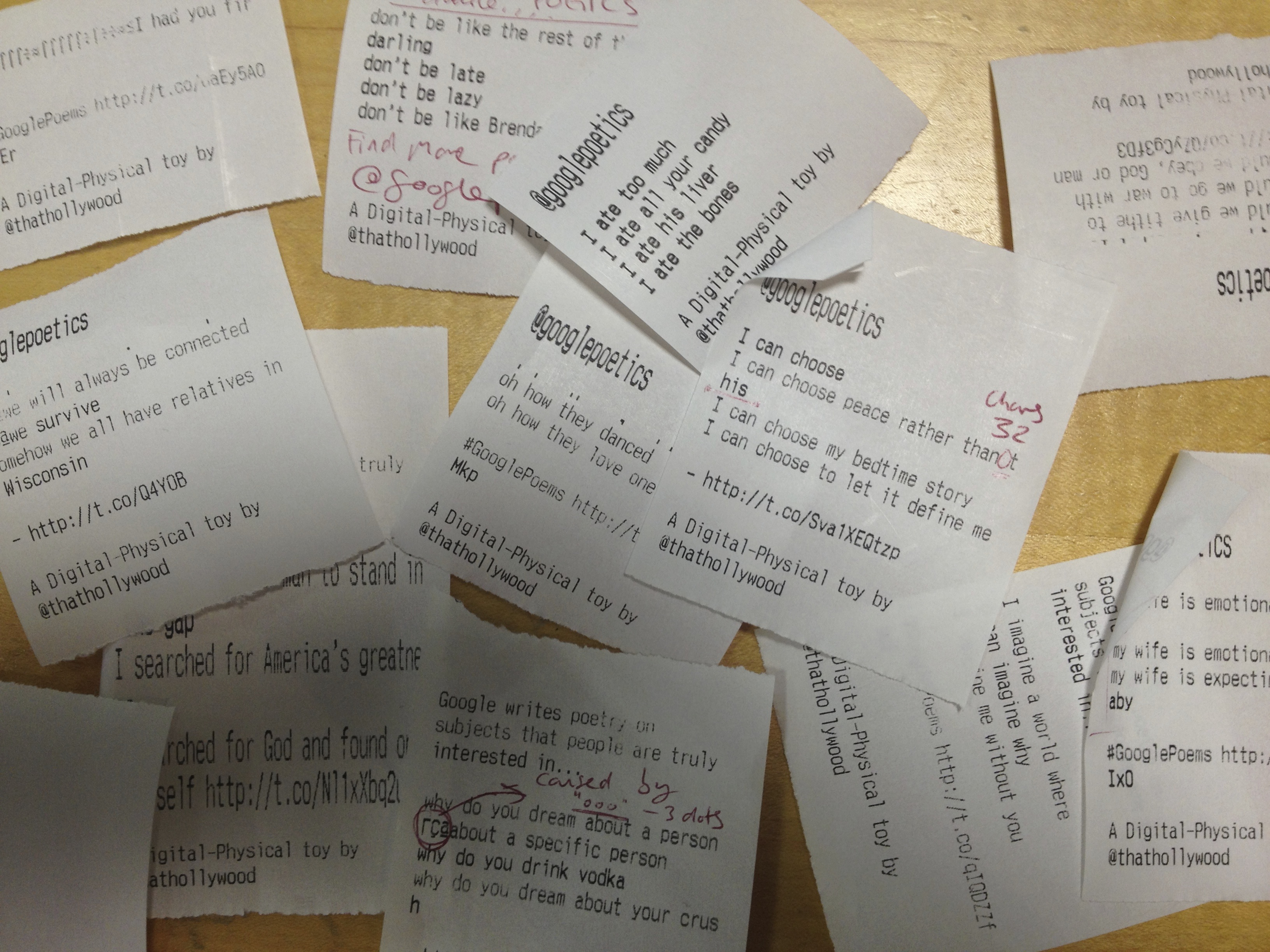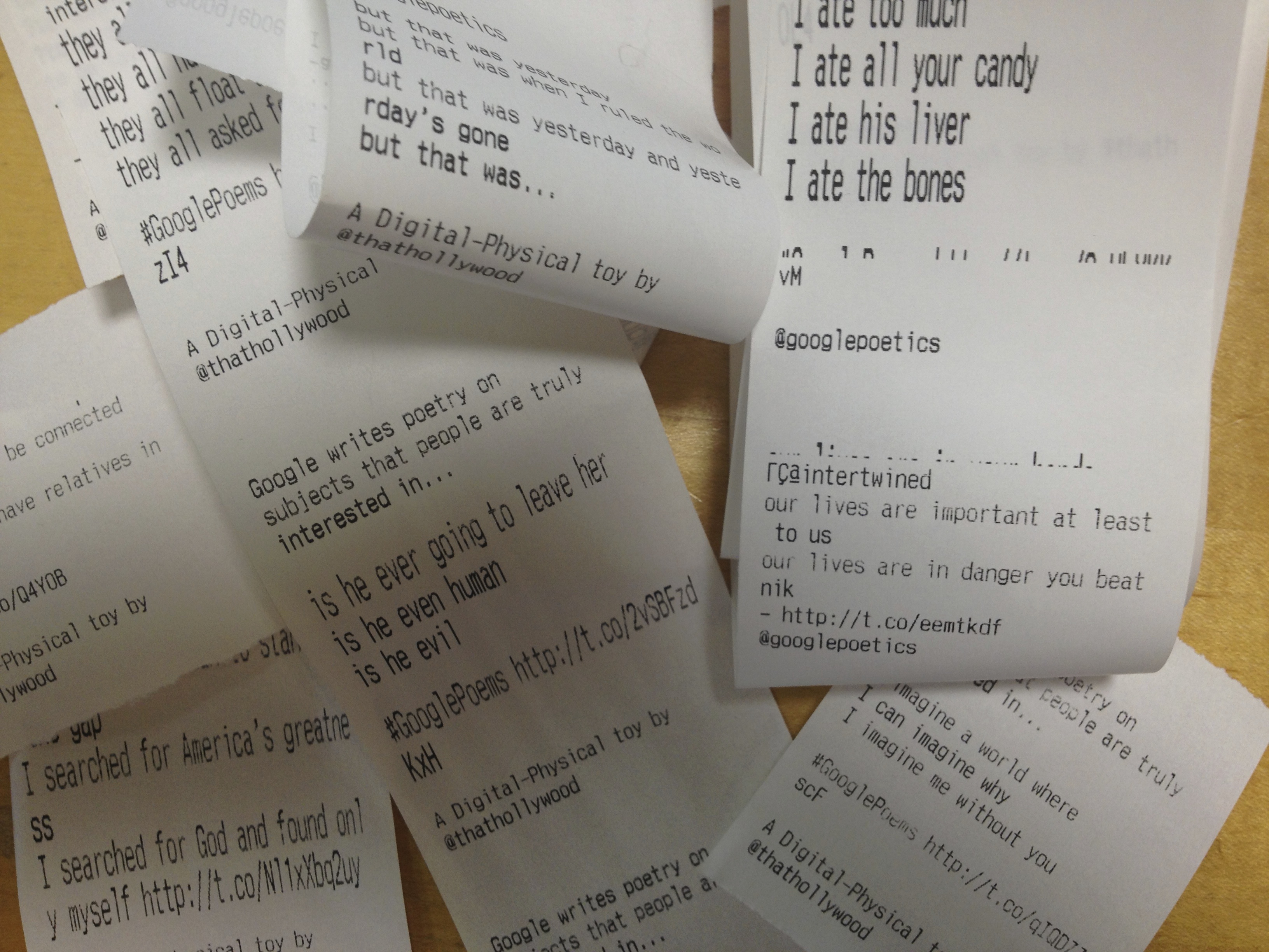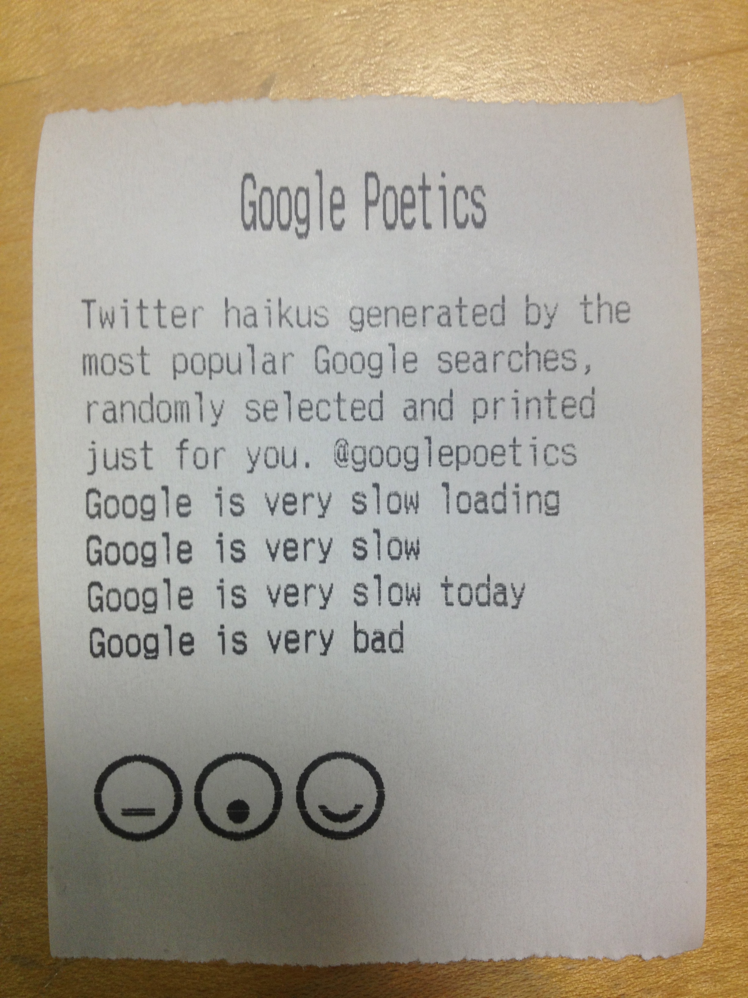 We presented, and I finished off the talk by introducing the Google Poetry Printer (bloody thing needs a name, dammit!) as, “a Digital Haiku generated by the most popular google searches, randomly selected and printed just for you”.