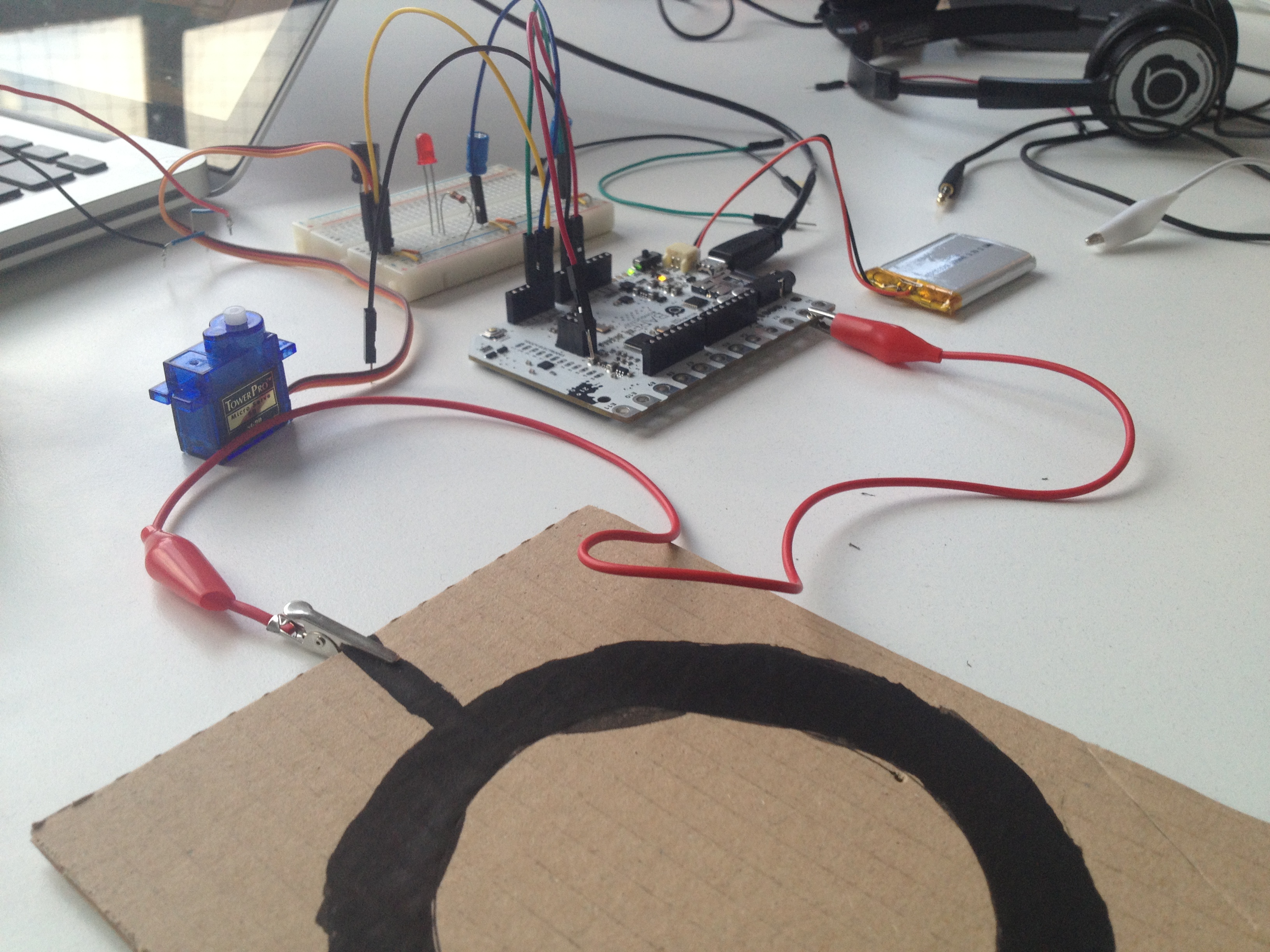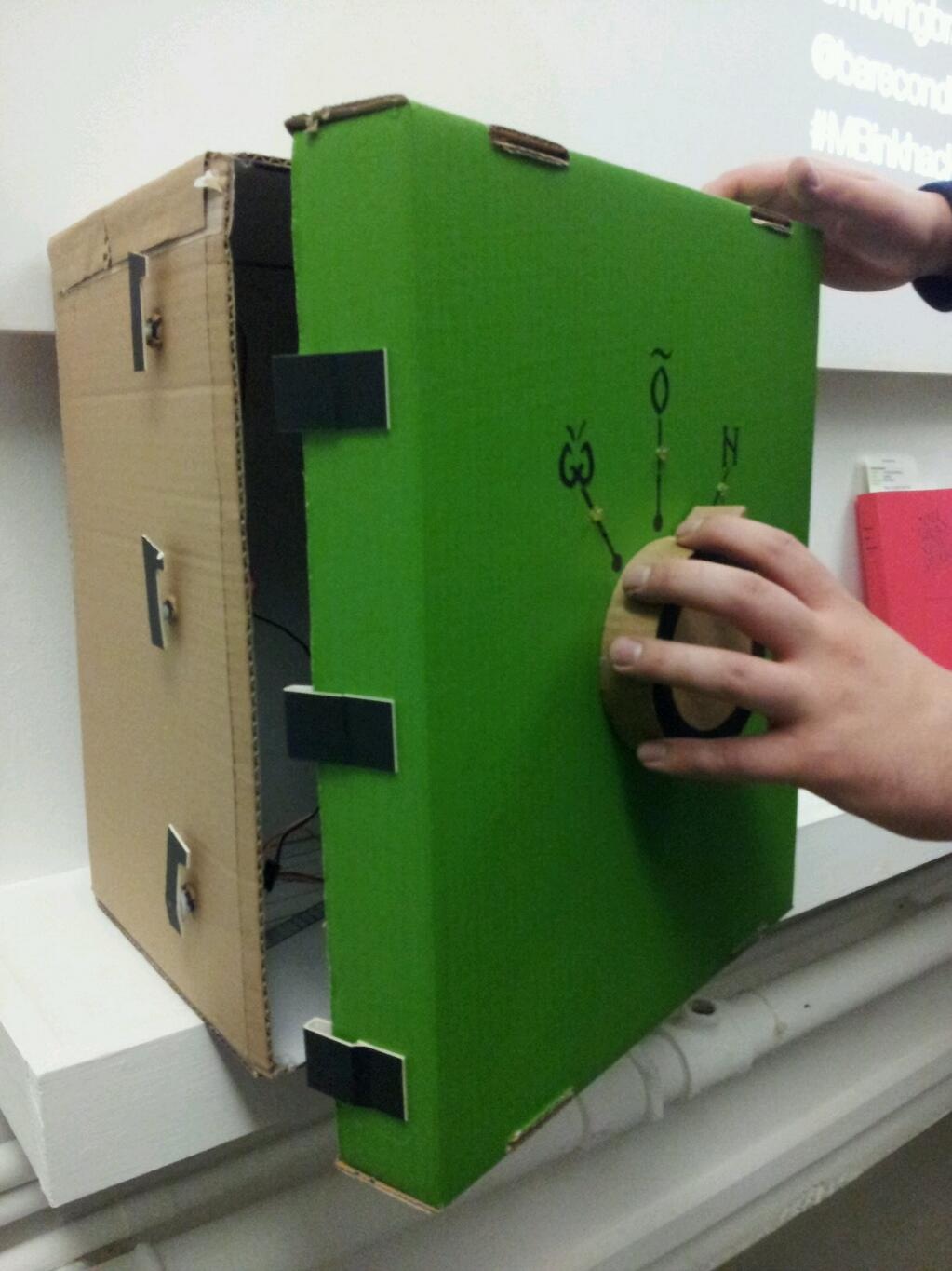 We settled on a Spy vs Spy inspired idea that used a combination of Touch & Hover over electric painted surface, to give a variety of capacitive values to unlock a ‘dead-drop’. This quickly morphed into a safe, and we even used the box that all our hackday bits came in to build it.