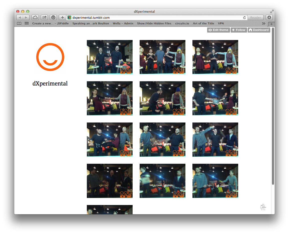 * Capacitive sensing using an Arduino Uno, Electric Paint and a TouchKey USB shield (£18 eBay). WebCam capture via Processing, and jpegs posted to Tumblr via Python and Temboo. 🙂