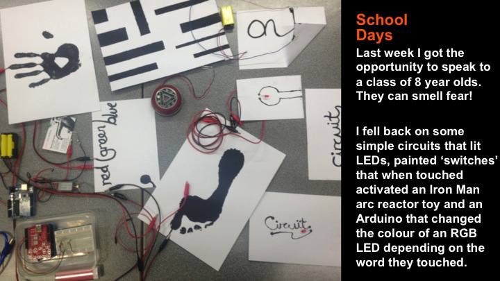 And from there into forays into Experience triggered via Capacitive Sensing. Below is a example of some of the Electric Paint interfaces I created for talk on circuits at my son’s school.
